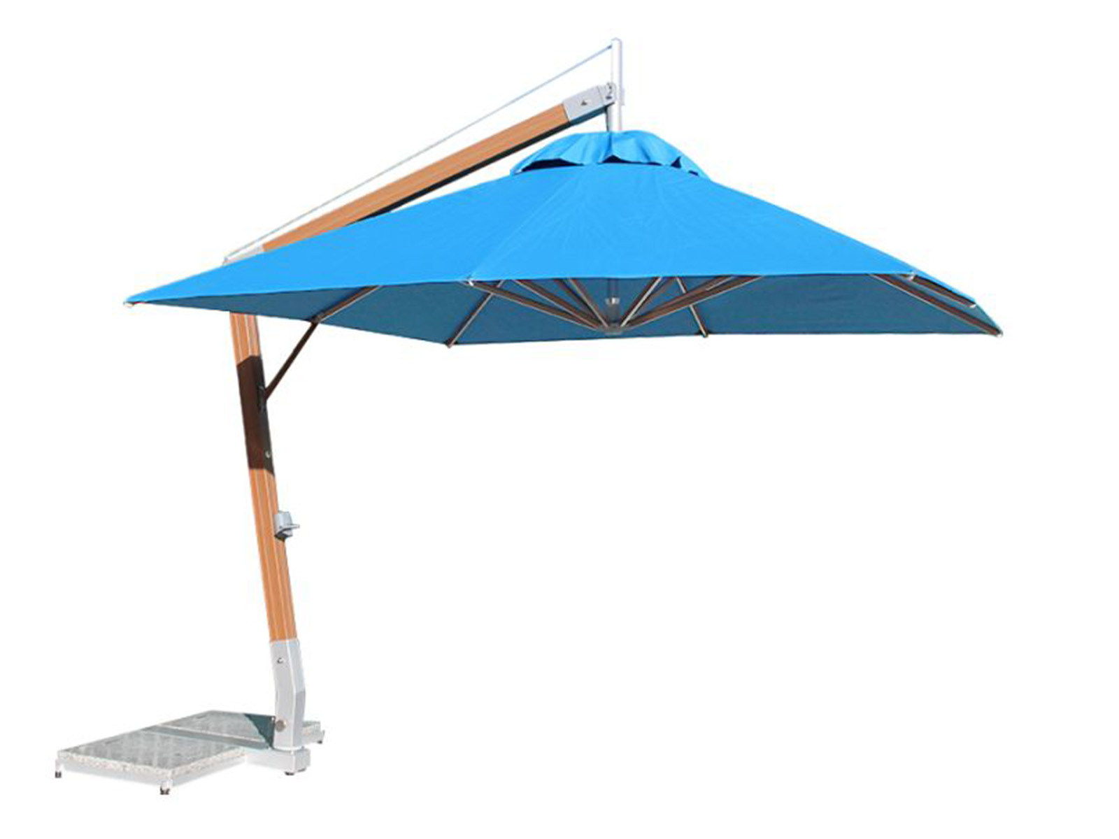 Base en granit avec roulettes – Permet de déplacer et ajuster le parasol selon les besoins. Le modèle carré de 3 m utilise 2 plaques de granit de 70 kg sur le dessus, tandis que le modèle carré de 3,4 m dispose de 2 plaques de 70 kg sur le dessus et de 2 plaques de béton de 30 kg à la base inférieure.