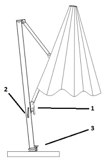 Détachez la sangle de l’auvent, appuyez sur la poignée (1) et faites glisser le curseur vertical vers le haut d’environ 50 cm, jusqu’à ce que l’auvent se sépare du mât latéral, puis relâchez la poignée. Tournez la manivelle (2) dans le sens des aiguilles d’une montre jusqu’à ce que l’auvent soit entièrement ouvert. À l’aide du curseur (1), ajustez l’inclinaison verticale jusqu’à atteindre la position souhaitée. La pédale (3) sert à fixer le mât et l’auvent pour éviter qu’ils ne tournent avec le vent. Pour faire pivoter le parasol sur son axe, appuyez sur la pédale (3), faites pivoter le parasol, puis relâchez-la.